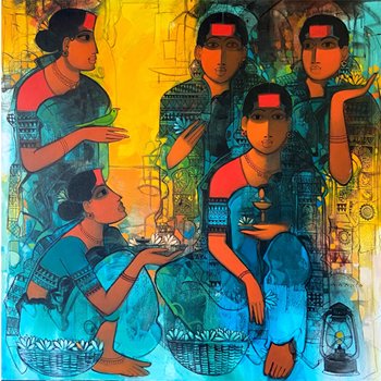 These new paintings by Sachin Sagare, like his previous body of work, arrives in a headlong rush of invention festooned upon a canny theme, in this case the female body in nature. He places groups of rural women worshippers; he names them as nymphs, dryads and goddesses into clearings in deep, dark background, thus activating irresistible tropes of an Indian painting tradition meant for royals. A more occult art comes to mind in these unkempt, unruly wildernesses, one which begins with the temple women.