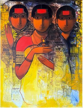 The large acrylic paintings in the exhibition swirl chorus of graphically insistent folk women, white blossoms and filigreed stalks that recalls the backyard raptures of rural India. Sagare’s glades are uninhabited; their everyday ecstatic includes luminous beings, spirits of the feminine whose spare, archaic profiles float among the flowers. Faces, flowers, oil lamps and puja-thalis are painted with a kind of folk-art zeal while the cerulean temple walls behind, solidly modeled then dematerialized by dancing layers of sprayed pigment, is appealingly contrary in color, scale and attack.