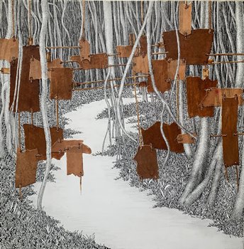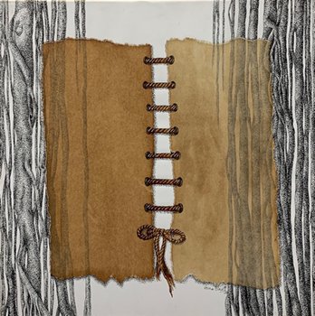 In the other suite of works titled ‘Roots and Bonds’, the artist changes the medium to pen on canvas, focusing the visual on specific figurations and intended meaning. Here the visual focuses upon the roots of old trees, which clasp at the earth with all their might, almost inseparably. Over this finely penned backdrop, Bhatt paints patch-worked parchment-like pieces, sewn together roughly, as a metaphor for binding. The concept is about roots, of trees, of people, of motherlands, of minds, of belonging, of love and of finding that one deep connection with something or someone to make one’s life purposeful. The works also could be seen as motifs which hold a picture together, the picture could be a reality or a person’s own reality, which is fragmented by the roles one plays in life, but is held together precariously only because of the rooted knowledge and spiritual essence of their core values. Unmoored by these precariously sewn threads, the parchments stand alone, meaningless and perforated by the inevitability of ignorance, as seen in one of the works.