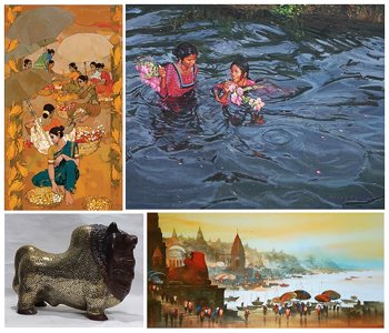 This show will depict the various works in realistic, Semi-realistic, abstract, surrealistic and contemporary as well as modern style in different mediums such as oil colours, acrylics,watercolors, etching, dry pastels and oil pastels, pen and ink, mix media etc and sculptures in bronze, metal relief scraps and mix media in the unique techniques and styles adopted by the participating artists. The works displayed in these show include landscapes, cityscapes, seascapes, beauty of nature, seasonal highlights of nature, historical monuments and their traditional heritage, figurative works showing various sentimental feelings on the faces of young sensitive women in their  perspectives realms of life, Journey of life, Market Place, vignettes of rural and Urban culture, icon of powers and many more thematic peculiarities.
