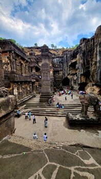 One of the most notable monuments at Ellora is The Kailasha temple Cave 16, carved entirely out of a single rock face that covers an area twice the size of the Parthenon in Athens.